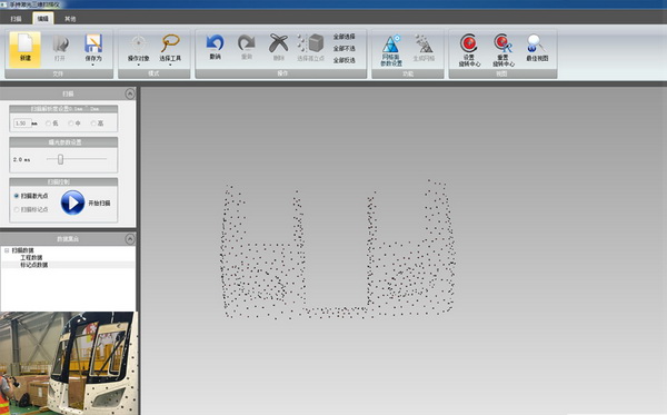 以全局?jǐn)z影測(cè)量系統(tǒng)獲得的標(biāo)記點(diǎn)數(shù)據(jù)為整體基準(zhǔn),輻射到個(gè)別掃描區(qū)域,掃描汽車整車以及部分拆解后的零件,獲取其三維數(shù)據(jù)。